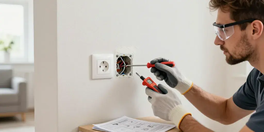 Vérifier coupure du disjoncteur, présence d’un testeur, tournevis isolé, boîte d’encastrement et prise adaptée.