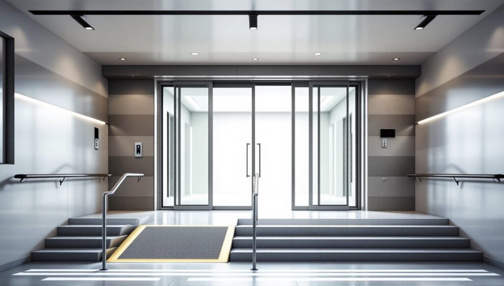 - Portes automatiques ou à faible effort d’ouverture, stoppeurs pour éviter tout danger
